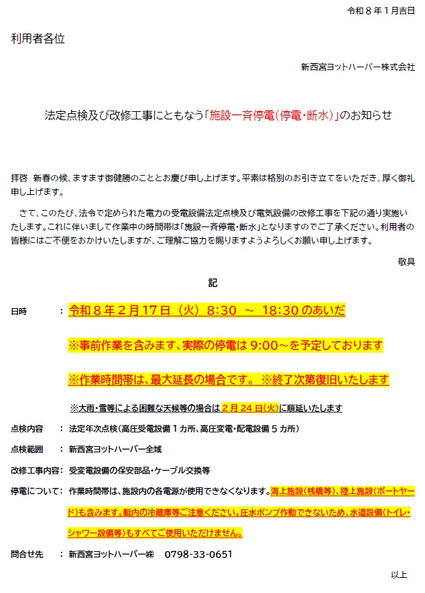 メンテナンス休業中の施設一斉停電・断水についてのお知らせ